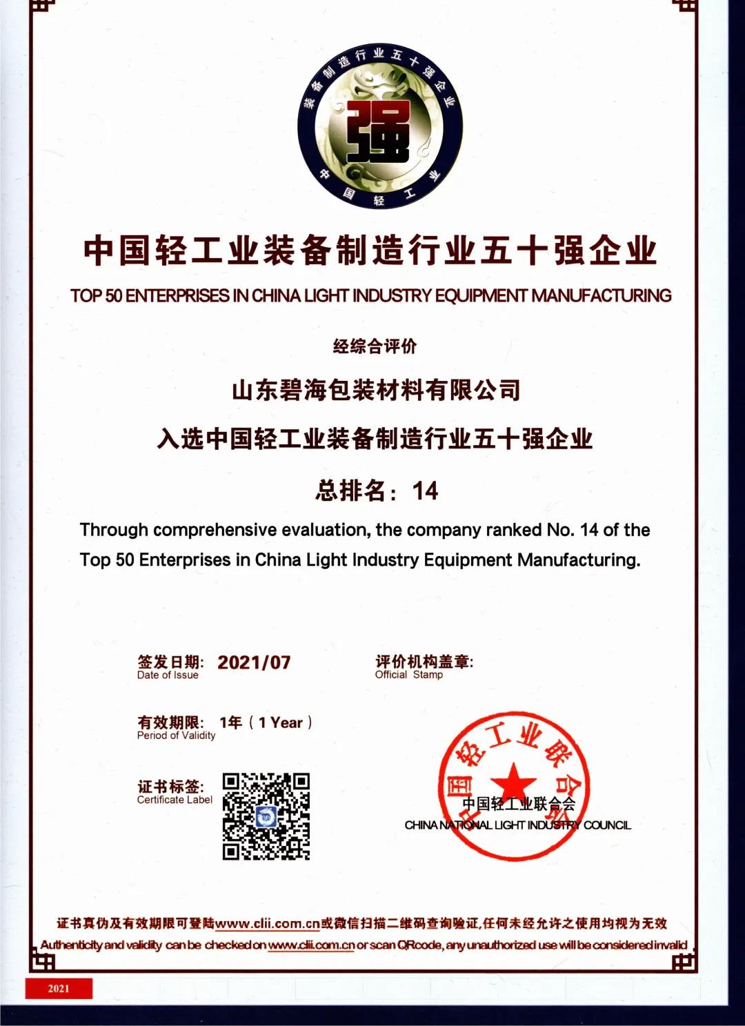 2021年7月20日,在北京召開的“奮進‘十四五’領航新消費”中國輕工業(yè)百強企業(yè)高峰論壇上,碧海公司入選中國輕工業(yè)裝備制造行業(yè)五十強企業(yè)(排名14)、中國液態(tài)食品機械行業(yè)十強企業(yè)(排名4),這是對我公司綜合實力、創(chuàng)新成就的高度肯定和認可。