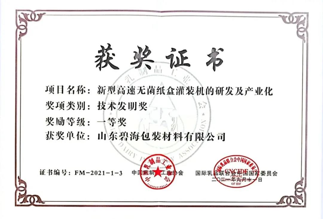 11日,在2021年度中國乳業(yè)科技系列頒獎(jiǎng)盛典上,碧海包裝又一新型高速無菌紙盒灌裝機(jī)獲技術(shù)發(fā)明獎(jiǎng)一等獎(jiǎng),公司執(zhí)行總經(jīng)理王立上臺(tái)接受頒獎(jiǎng)。